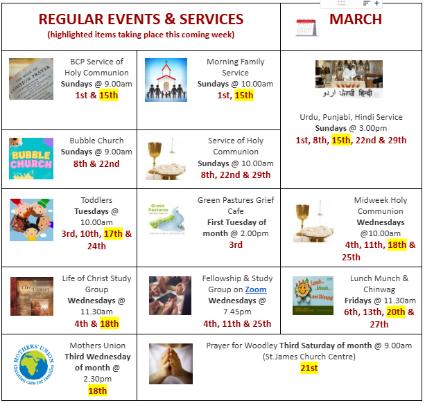 10.00am - Morning Family Service. The Fourth Sunday of Lent. Mothering Sunday. This week’s Bible readings will be Exodus 2: 1-10 and Luke 2: 33-35. A video recording of the service will be uploaded to the website at: https://www.youtube.com/@stjohnswoodley