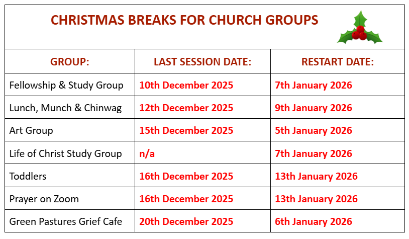 FELLOWSHIP & STUDY GROUP ON ZOOM. Please note the Fellowship & Study Group are taking a break over the Easter period, so there will be NO meeting on 8th April. They will return on Wednesday 15th April 2026 at 7.45pm on Zoom.